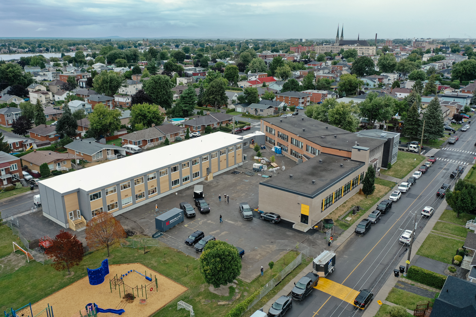 Le projet consistait en l’ajout d’un bâtiment modulaire d’une superficie totale d’environ 12 000 pieds carrés, adjacent à l’école existante. Les travaux ont débuté par la préparation du terrain, incluant le nivellement du sol. Les modules préfabriqués ont été livrés et assemblés sur place. Des murs de jonction ont été installés entre les modules pour assurer l’étanchéité et la durabilité des espaces.